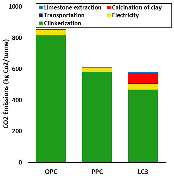 The production of LC3 emits as much as 40% less CO2 than OPC and 11% less CO2 than PPC. The energy consumed in producing LC3 is also significantly lower than OPC and even lower than PPC in many scenarios.